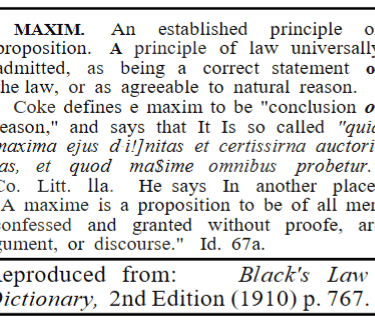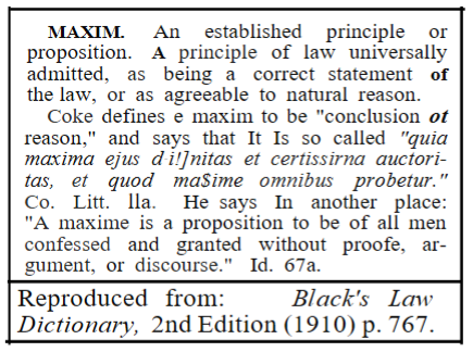 Maxim of Law: An established principle or proposition. A principle of law universally admitted, as being a correct statement of the law, or as agreeable to natural reason. Coke defines a maxim to be “conclusion of reason,”